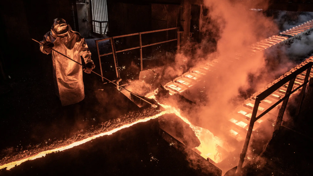 Рідина, схожа на лаву, просочується з основи печі, коли вкриті кіптявою люди у світловідбивних костюмах із капюшонами, в товстих рукавичках та захисних щитках спрямовують розпечений потік із ковшів.