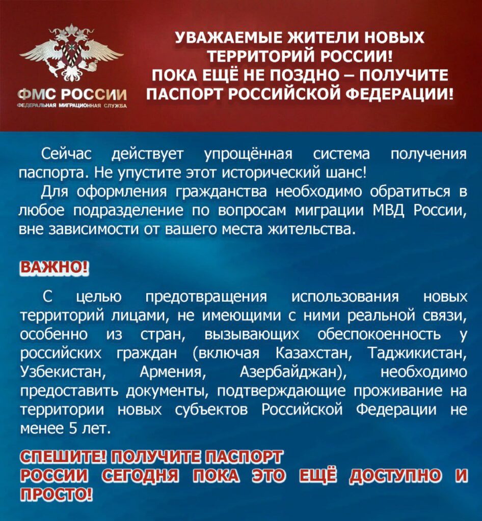 На тимчасово окупованих територіях України, зокрема в Бердянську, російська окупаційна влада продовжує агресивно нав’язувати паспортизацію. В соцмережах поширюються оголошення із закликами терміново отримати російський паспорт, поки це «ще доступно і просто».