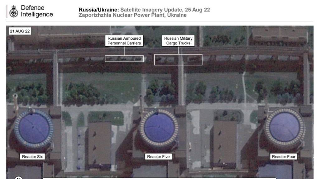 «Згідно з супутниковими знімками від 21 серпня, Росія зберігає посилену військову присутність на Запорізькій АЕС, а її бронетранспортери розгорнуті за 60 метрів від реактора номер п’ять», – йдеться у повідомлені.