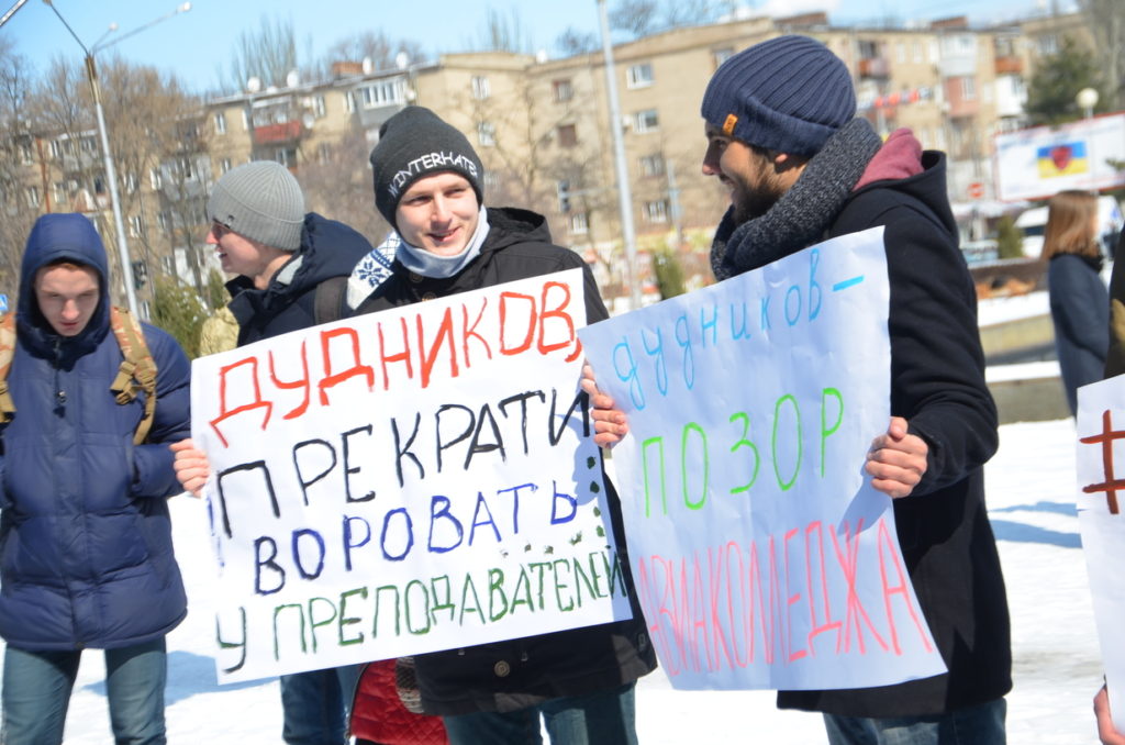 – Относительно директора возбуждено уголовное производство по факту растраты бюджетных средств путем злоупотребления служебным положением. Сейчас сложно говорить о сумме. Мы требуем отставки от занимаемой должности директора авиационного колледжа Александра Дудникова, который злоупотребляя своим положением снимал надбавки с педагогического коллектива и ставил им минимальные процентные ставки и выписывал своим замам премии в два-три оклада, – поделился руководитель общественной организации «Антикоррупционное движение Запорожья» Константин Белов