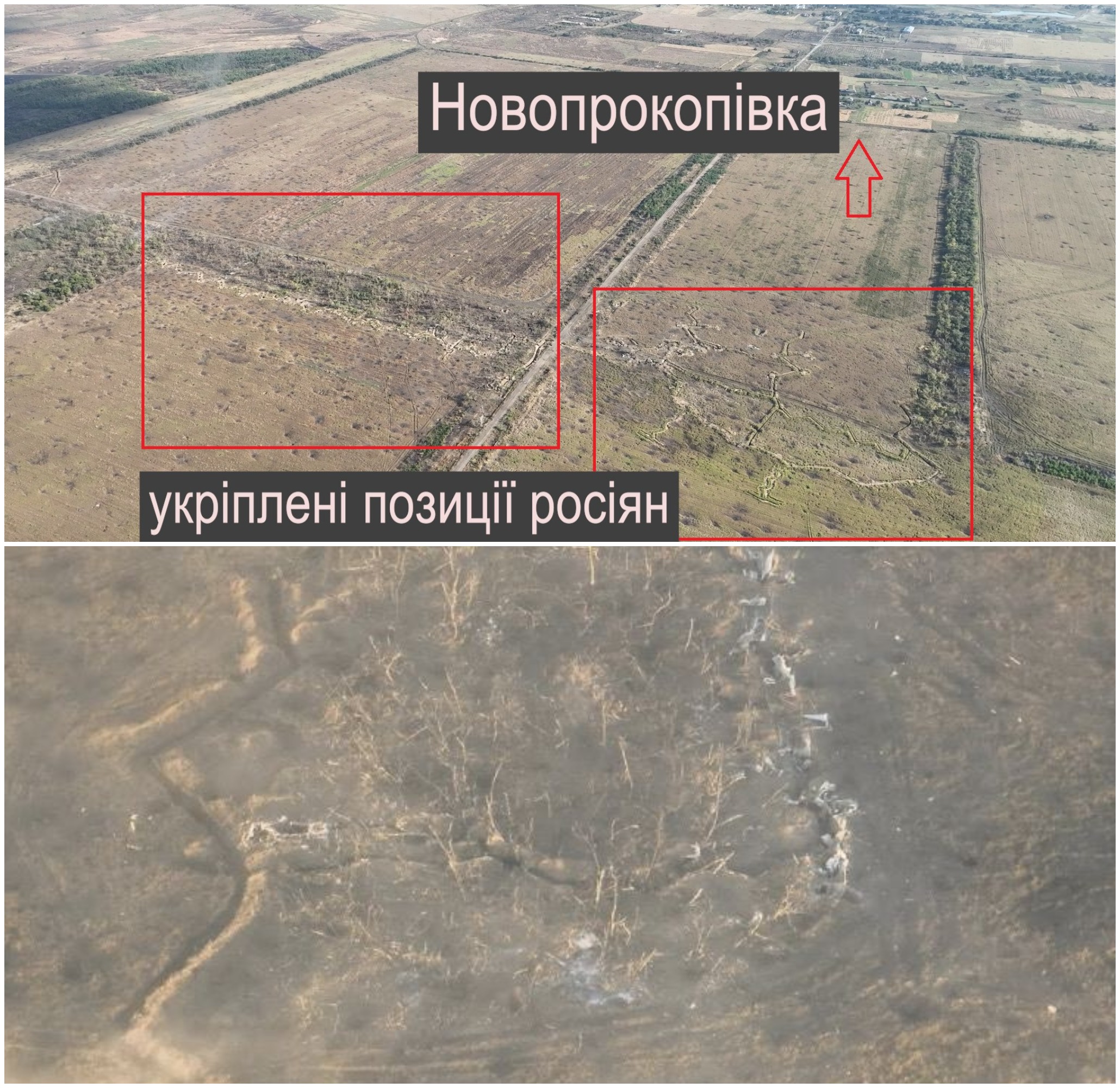 Неподалік села Новопрокопівка окупанти влаштували систему перекритих ходів, бліндажі та вогневі позиції. За словами військового, деякі окопи перекриті згори на велику протяжність.
