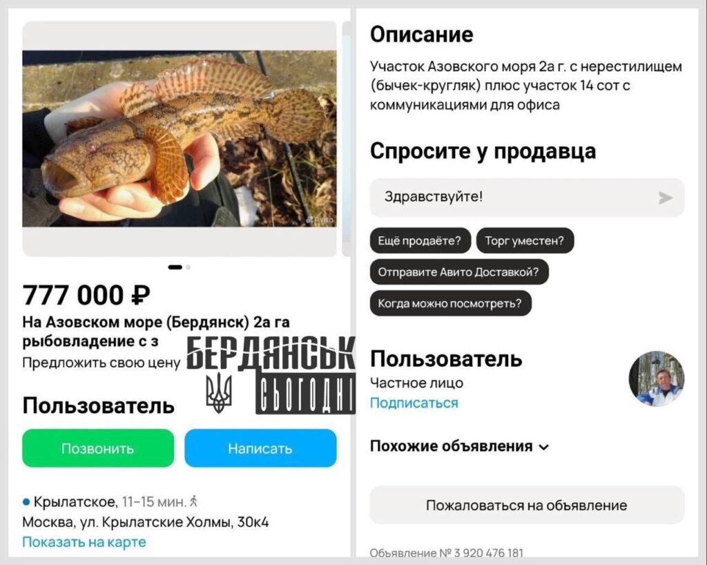 «Ділянка Азовського моря 2 га з нерестовищем (бичок-кругляк). Плюс ділянка 14 соток з комунікаціями для офісу», — таке оголошення розмістила якась приватна особа з Москви.
