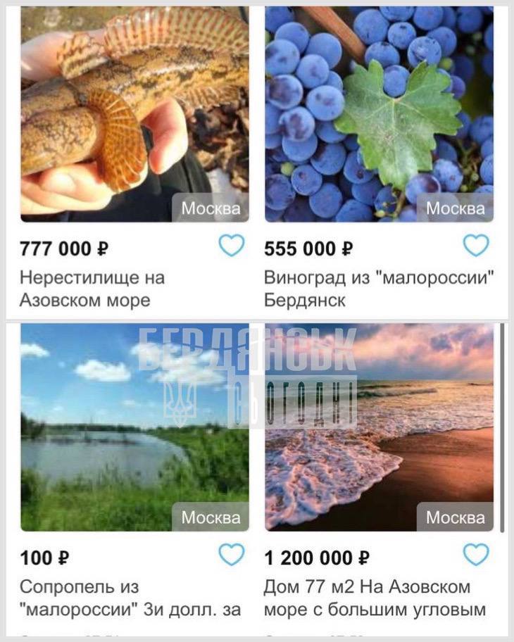 За це ділок просить 777 тисяч рублів. Окрім того, цей «продавець» також виставив на продаж будинок на 77 квадратних метрів на Азовському морі, виноград та сапропель з приміткою «з малоросії».