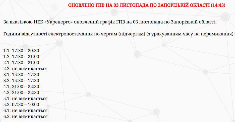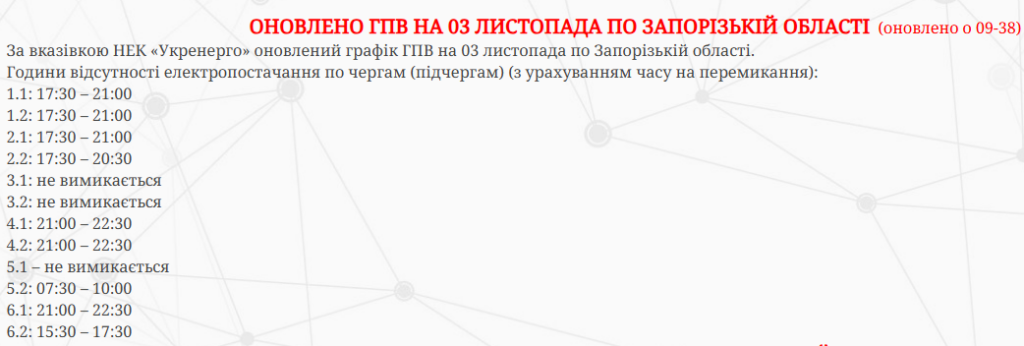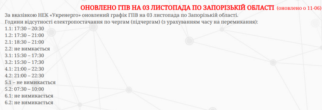 За вказівкою НЕК «Укренерго» оновлений графік ГПВ на 03 листопада по Запорізькій області. Години відсутності електропостачання по чергам (підчергам) (з урахуванням часу на перемикання):