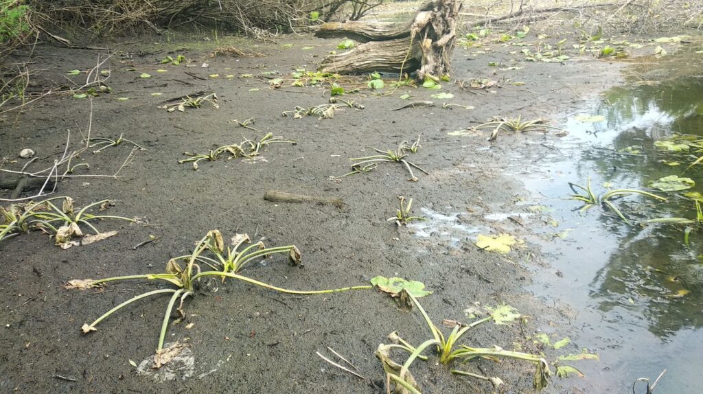 «Вони виглядають як суходільні кущі: листя і квіти ростуть прямо з ґрунту, – розповідає в.о. завідувача сектору охорони природи Національного заповідника «Хортиця» Михайло Муленко. – Це виглядає нетипово, але не можна сказати, що рослини дуже пригнічені. Вони витримали такі умови протягом 2023 і 2024 років. Зараз, із початком нового вегетаційного сезону, ми спостерігаємо, як вони поводитимуться у 2025-му. Частина ще жива, а частина вже загинула. Можливо, через те, що волога опустилася глибше, і коріння не може її дістати, або ж через вимерзання. Адже умови зимівлі на суші зовсім інші: під водою температура дна стабільна – близько +4°C, а на відкритому ґрунті він промерзає, і холод проникає до коріння. Це нові умови, яких раніше не було, і ми їх ніколи не досліджували. Фактично ми першовідкривачі процесів, які в Україні ще ніхто не спостерігав».