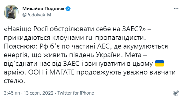 “Навіщо Росії обстрілювати себе на ЗАЕС?” – прикидаються клоунами ru-пропагандисти. Пояснюю: РФ б’є в частині АЕС, де акумулюється енергія, що живить південь України. Мета – від’єднати нас від ЗАЕС та звинуватити у цьому українську армію”, – написав у Twitter радник керівника Офісу президента Михайло Подоляк.