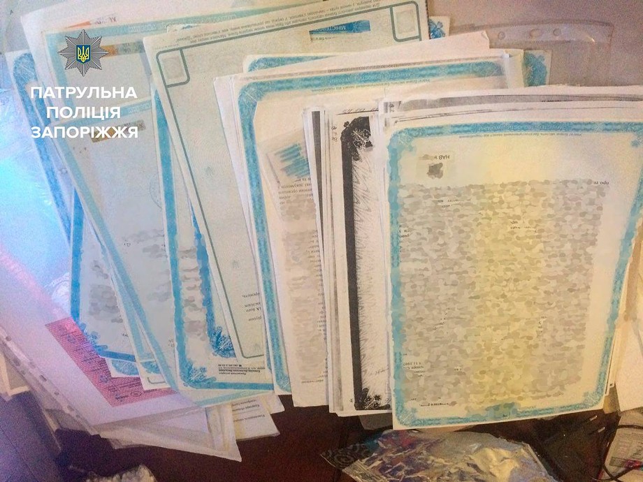 В злополучной квартире обнаружили кипу документов, на которых были заметны следы подделки. Также в комнате нашли мокрые печати, штампы, паспорта и свидетельства о рождении, смерти и браке. Помимо этого, правоохранители обнаружили липовые документы, которые подтверждали имущественные права на недвижимость. Об этом сообщает пресс-служба ГУ Национальной полиции в Запорожской области.
