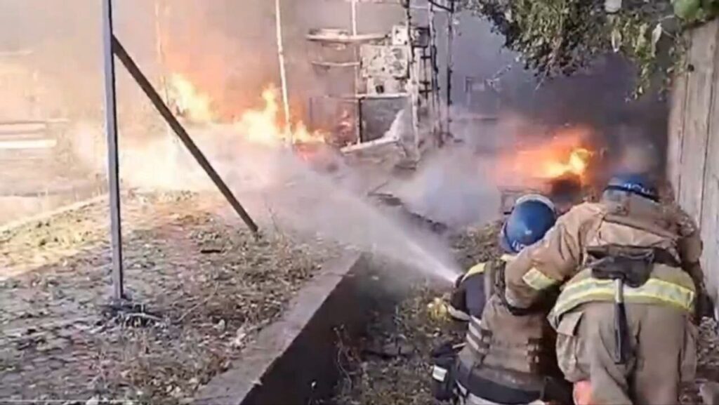 Як зазначають в ДСНС в Запорізькій області внаслідок ракетної атаки виникло два осередки пожежі: перший в адміністративній двоповерховій будівлі, другий – в газовому модулі поблизу.