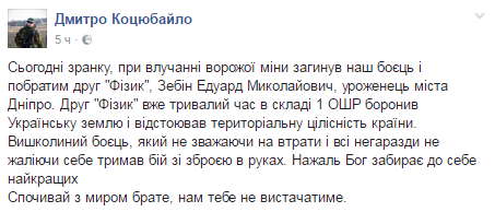 – Утром при попадании вражеской мины погиб боец первой отдельной штурмовой роты ДУК “ПС” с позывным “Физик”, Зебин Эдуард Николаевич, уроженец города Днепр, – пишет командир.