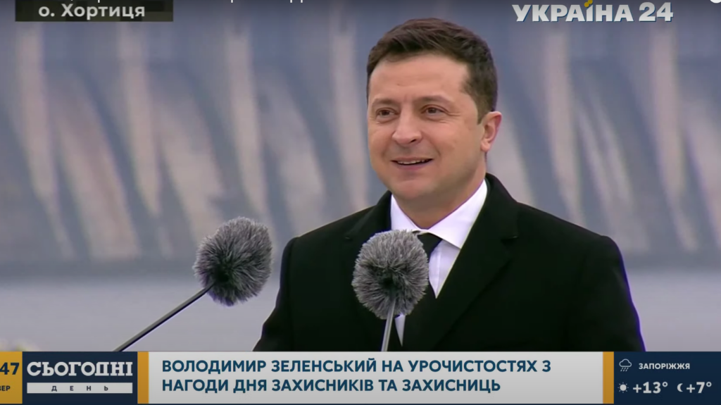 «Сегодня я не вижу тут детей, школьников, бывших девятиклассников. Передо мной стоят мужчины. Да, им еще предстоит научиться многим нюансам военного дела. У военных, который я встречаю в зоне боевых действий, я вижу силу не в количестве вооружений, а во взгляде. Эту же силу я вижу в глазах 150 лицеистов из Запорожья, Кривого Рога и Луганска. Сегодня, 14 октября, тут вы рождаетесь, как будущие защитники суверенитета Украины, нашей территориальной целостности. У каждого из вас есть свои успехи, свои поводы для гордости, но общим для вас, и это неизменно многие годы, это ваши ценности, выраженные в традиционном слогане лицеистов – «Государство. Честь. Отвага», – поделился во время своего выступления президент Украины Владимир Зеленский. – Украине и этим чеснотам вы присягаете на верность на месте уникального природного и исторического комплекса Украины – Хортицы, которая имеет сакральное значение для каждого из нас, для всех украинцев. На протяжении многих столетий Хортица была свообразным форпостом в борьбе с разными врагами. Именно тут родился и ковался непобедимый дух козачества, который и в наше время помогает бороться с врагами. На традициях и ценностях украинского козачества сегодня воспитывается будущая элита национального украинского войска».