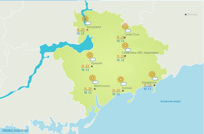 У неділю по всій території Запорізької області температура впаде на кілька градусів: слід очікувати на +21-23 тепла. Вночі відмітка градусника знизиться до відміток +10-12. Вночі та вдень без опадів, вітер також північно-західний 5-10 м/с.