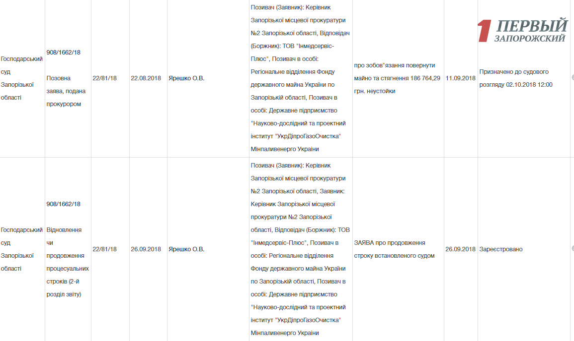 Хозяйственный суд Запорожской области открыл производство по иску руководителя Запорожской местной прокуратуры №2 Романа Мазурика к ООО «Инмедсервис-плюс».
