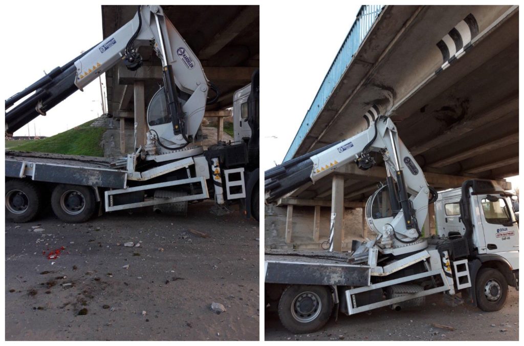 Водій автокрану не розрахував габарити машини, і застряг під мостом. Ймовірно, автомобіль не помістився під мостом через частково висунуту стрілу.