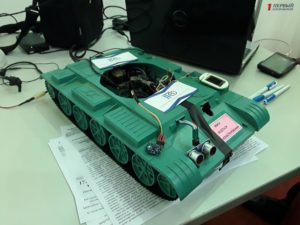 – Когда-то давно это была обычная детская игрушка. Сейчас вы смотрите на универсальную машину, которая оборудована сенсорами движения, температуры и освещения. При наличии вспомогательных комплектующих (ноутбука, смартфона) и интернета, роботом можно управлять удаленно. Он может двигаться в любом заданном направлении, кроме вверх. Устройство движется медленно и “ест” много энергии. Кроме этого “Танк” способен передавать видео с USB-камеры в браузер. Уже сегодня это интересное устройство, однако, конечно, мы продолжим его совершенствовать, – рассказал Алексей Фарафонов.