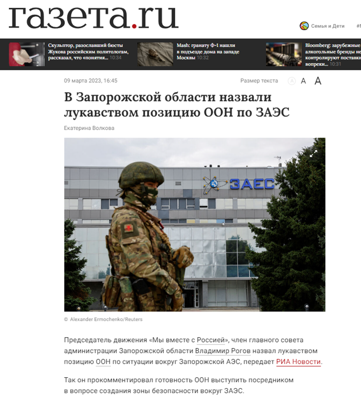 Заяву генерального секретаря ООН Антоніу Гутерреша про готовність організації стати посередником з метою повної демілітаризації зони та повернення станції до нормальної діяльності російські пропагандисти назвали «лукавством». Оскільки це рішення передбачає відхід російської армії, що, цитуючи агітпроп, «відкриває для українських бойовиків можливість захоплення ядерного об’єкту»: «Сегодня ООН стала организацией определенных наций, отражающих интересы исключительно США и Великобритании. Такое посредничество вызывает очень большое сомнение», – цитували державні російські ЗМІ пропагандиста Рогова (Джерело: Владимир Рогов, 10.03.23).