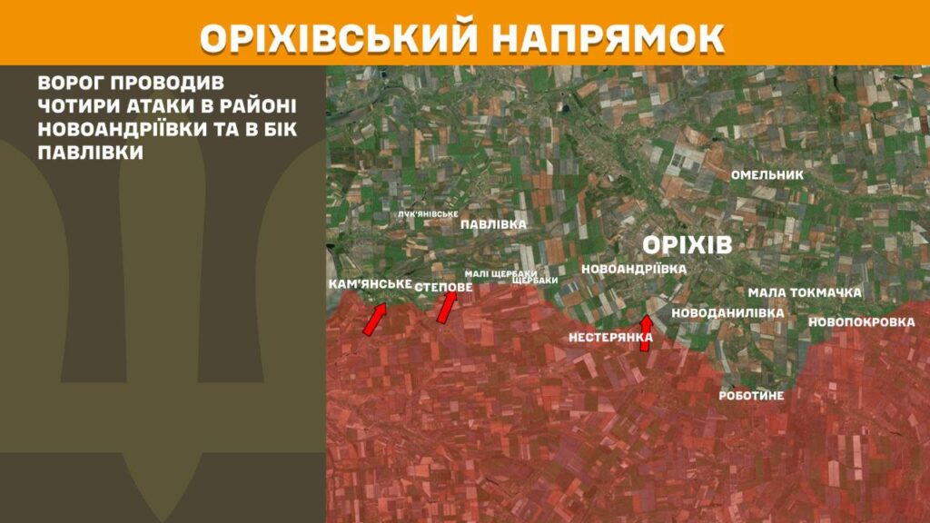 На Гуляйпільському напрямку ворог проводив одну наступальну дію поблизу населеного пункту Малинівка. На Оріхівському напрямку сьогодні окупанти проводили чотири атаки в районі Новоандріївки та в бік Павлівки.