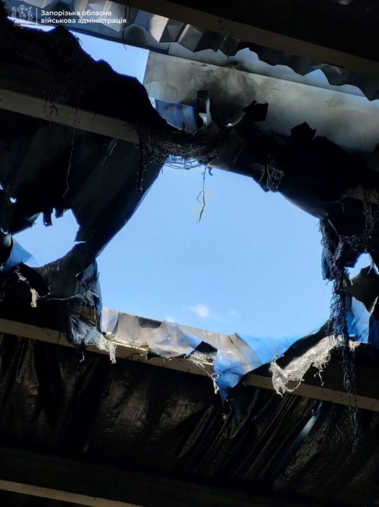 Повідомляється, що російський дрон поцілив у агропідприємство. Пошкоджено покрівлю будівлі.