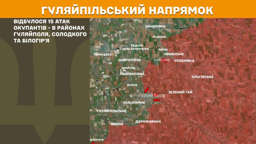На Александровском направлении противник в течение дня совершил 15 атак вблизи населенных пунктов Злагода, Рыбное, Зеленый Гай и в сторону населенного пункта Андреевка-Клевцово, Приволье.