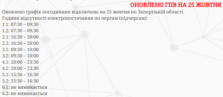 «Запорожьеоблэнерго» обновило график на 25 октября. Отключение для нескольких очередей ослабили.
