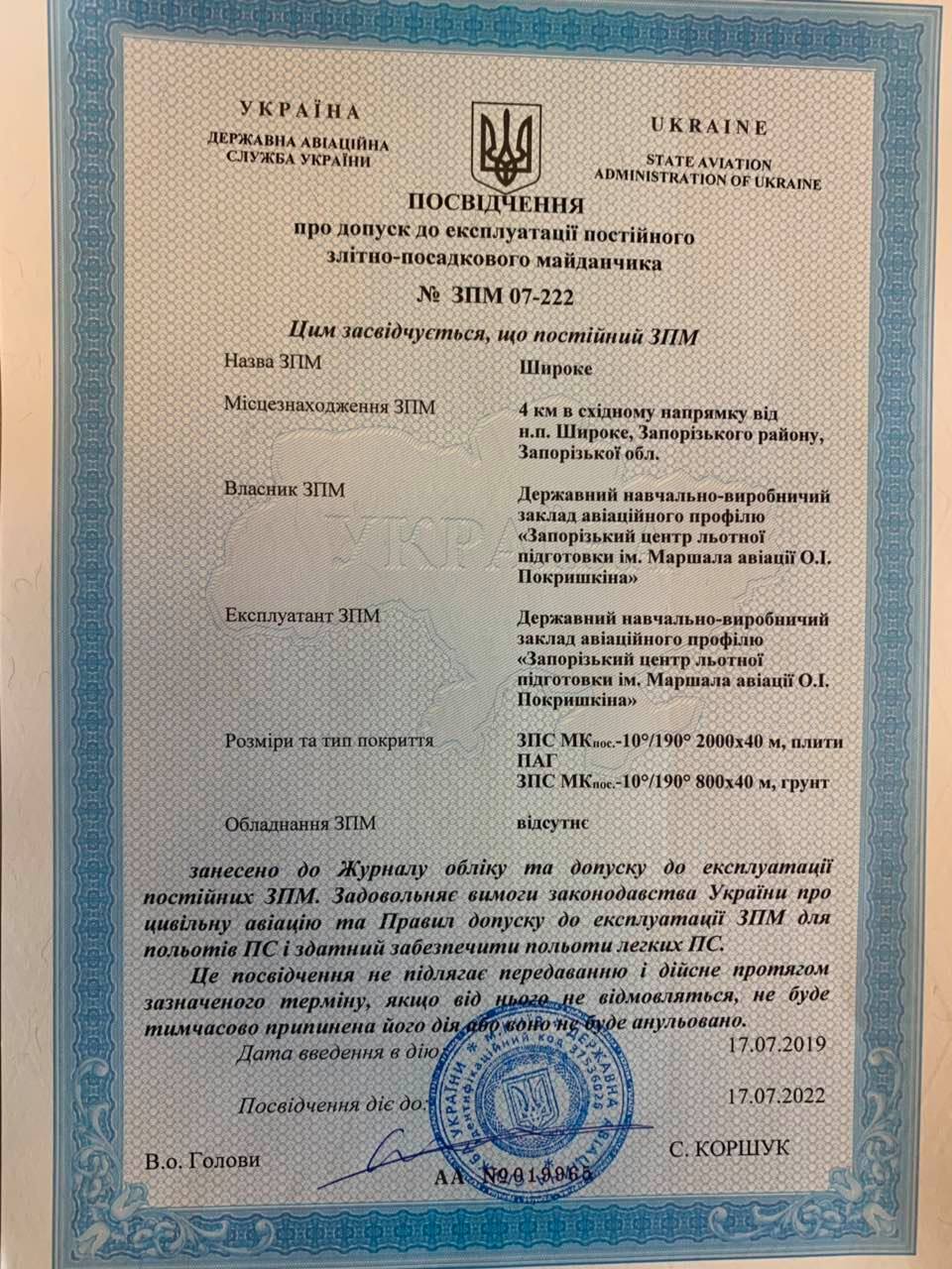 Запорожский центр летной подготовки им. Покрышкина получил сертификат про допуск к эксплуатации взлетно-посадочной площадки аэродрома в Широком.