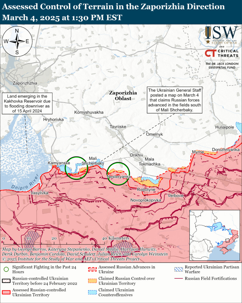 «4 марта украинский Генеральный штаб опубликовал карту, на которой отмечено, что российские войска недавно продвинулись в полях к югу от Малых Щербаков (к северо-западу от Работино)», — говорится в сообщении ISW.
