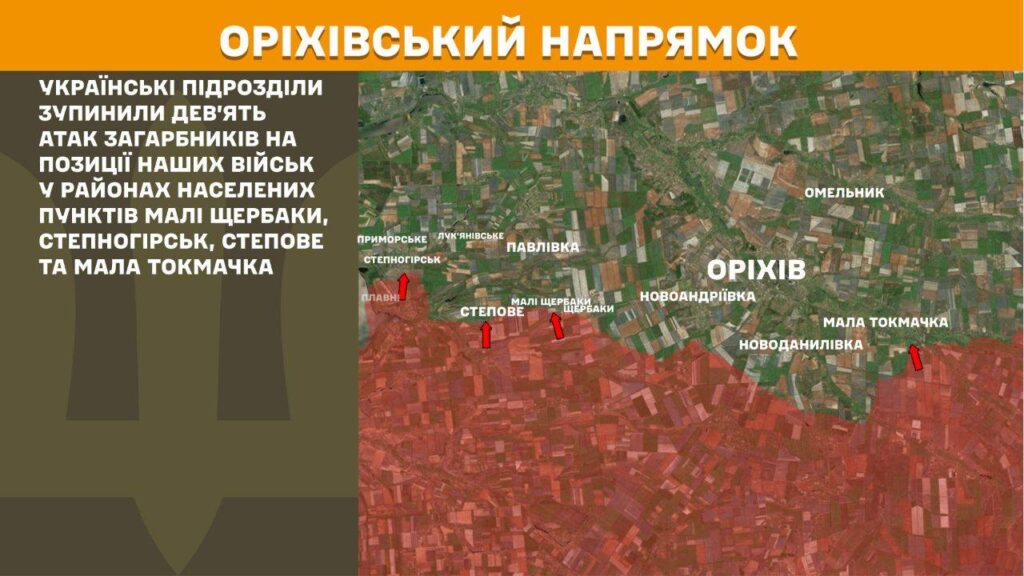 На Гуляйпольском направлении украинские воины остановили 31 вражескую попытку продвинуться в районах Варваровки, Сладкого и Гуляйполя. Еще 21 атаку россияне совершили на Александровском направлении вблизи населенных пунктов Зеленый Гай, Ялта, Толстое, Сичневое, Вербовое, Вишневое, Вороне и Рыбное.