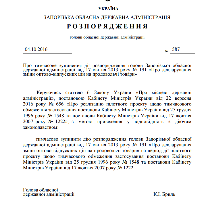 Председатель облгосадминистрации Константин Брыль подписал распоряжение об отмене декларирования оптовых цен на продовольственные товары.