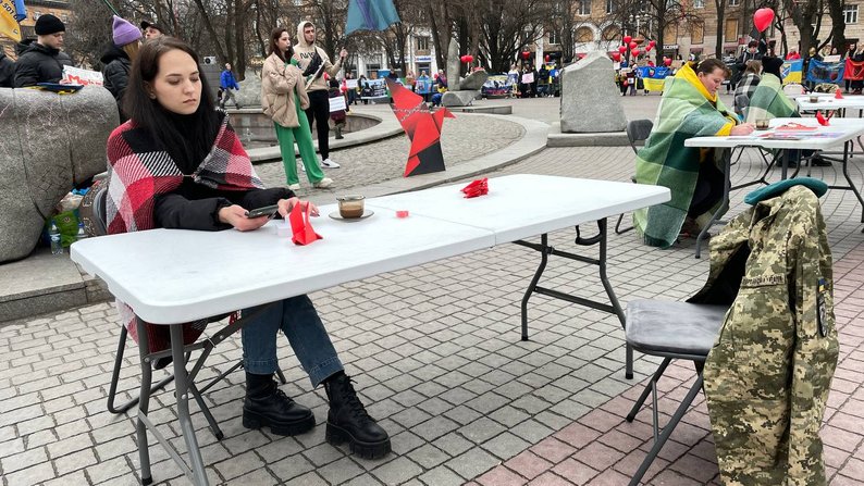 К акции присоединились около ста родных и близких бойцов, которые находятся в плену. Участницы сидели за столами напротив пустых стульев, на спинках которых была камуфляжная одежда. На фоне раздавались голоса с их чувствами. Перформанс символизировал ожидания женщин возвращения их родных.