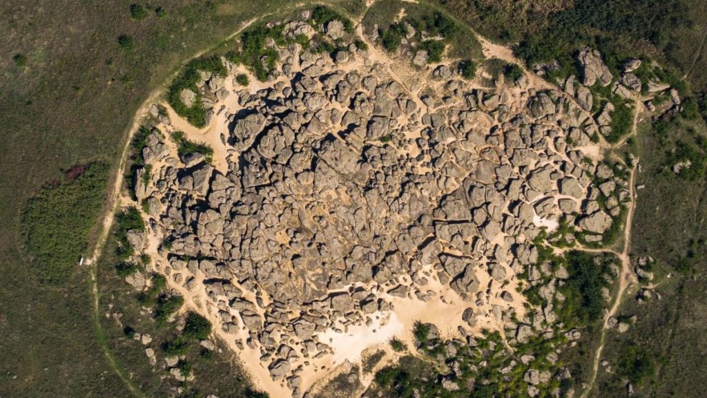 Эльдар рассказывает, что попал в природную достопримечательность в ходе рабочей поездки в с. Кирилловка в сентябре 2018 г. Говорит, что давно планировал посетить Каменную Могилу и воспользовался случаем побродить между глыб с камерой и сделать съемку с высоты 120 м. коптером.