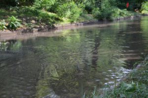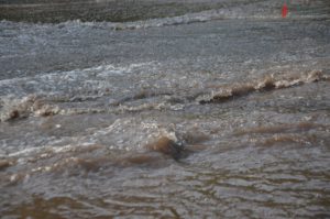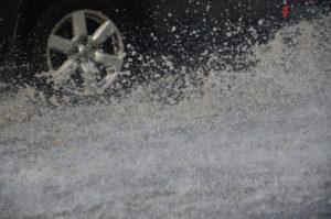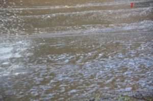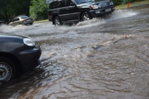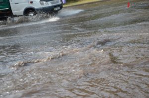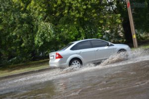 Автомобили буквально утопают в потоке воды. Водители стараются проезжать как можно медленнее и это приводит к небольшим пробкам. На некоторых участках дороги проехать вообще невозможно.