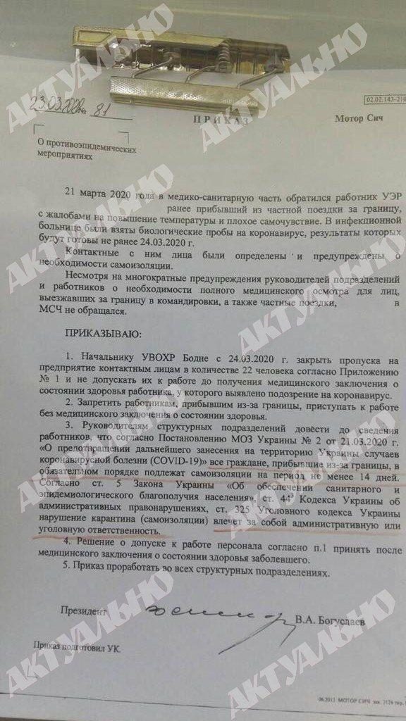 Из-за подозрения коронавируса на "Мотор Сичи" 23 человека отправили на карантин, — ПРИКАЗ