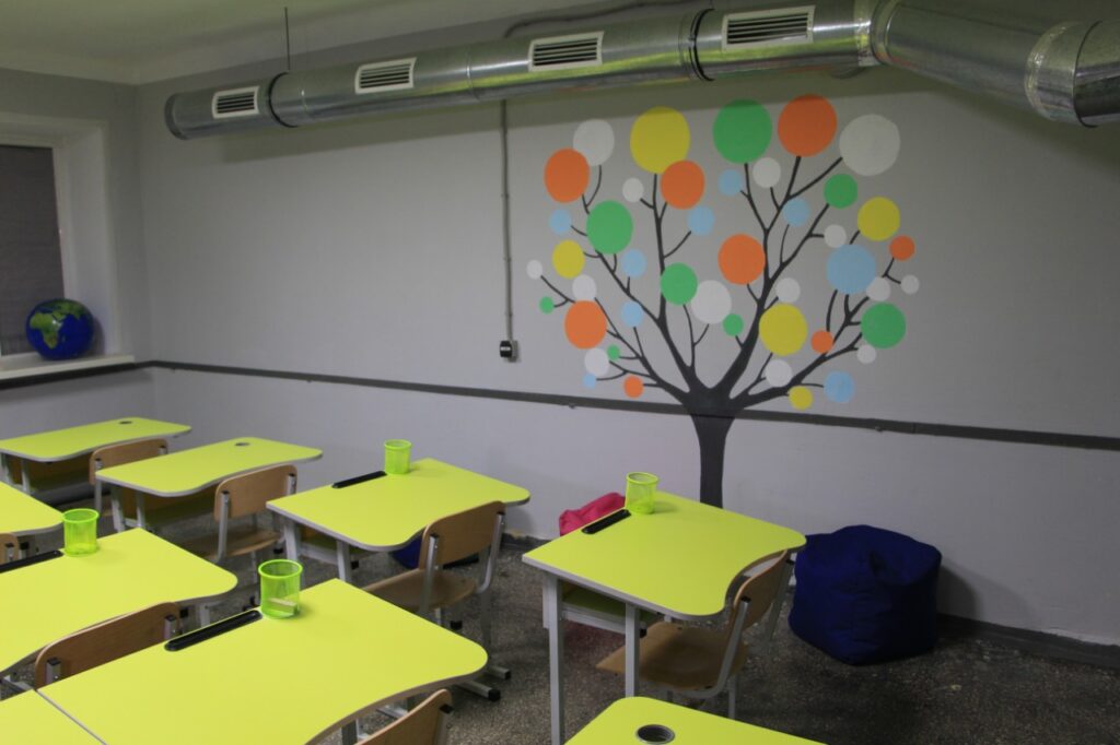 Во время перепланировки заменили систему электроснабжения, установили приточно-вытяжную вентиляцию и противопожарную дверь с системой «антипаника», обустроили санитарные комнаты. Есть вся необходимая мебель и оборудование. Помещение укрытия распределено на 7 локаций, есть комнаты для занятий, библиотека, место для оказания медицинской помощи и психологической разгрузки.