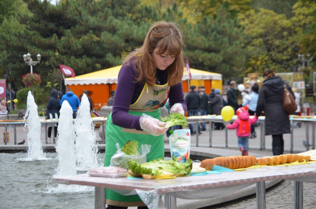 Ну, и конечно же обещанный гигантский бутерброд, который стал новым национальным рекордом в категории кулинарное искусство. Организаторы заявили, что это самый большой бутерброд в Украине — длинной 61 метр 20 сантиметров. Для приготовления такого гиганта понадобилось 129 батонов. Сам бутерброд состоял из белой булки, колбасы, майонеза и листьев салата.
