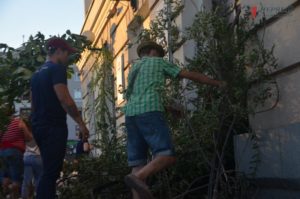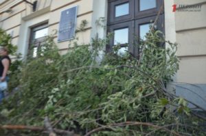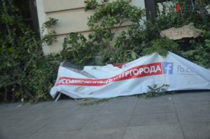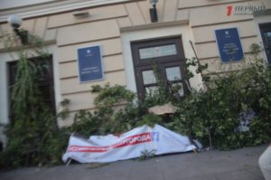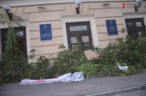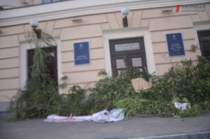Участники митинга вернулись к горисполкому не с пустыми руками: каждый принес с парка веточку и возложил ее к входу в Запорожский городской совет, как напоминание для властей о том, что с легкого позволения был уничтожен парк в центре города с десятилетними деревьями ради бизнес-интересов.