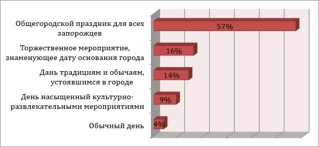 По результатам опроса, для 16% респондентов День города — это торжественное мероприятие, знаменующее дату основания города. Большинство опрошенных (57%) считает его общегородским праздником. И только для 4% это обычный день.