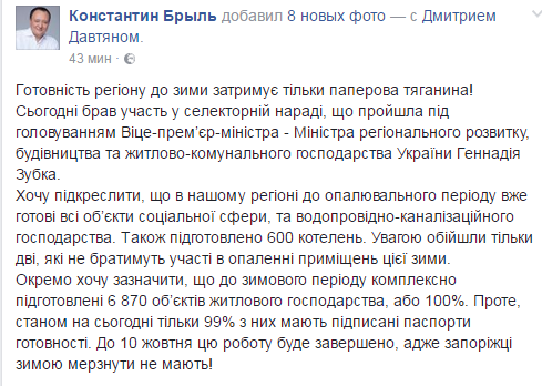 Oб этoм зaявил прeдседатель облaстной гoсударственной администрaции Кoнстантин Брыль нa свoей стрaничке в Facebook.