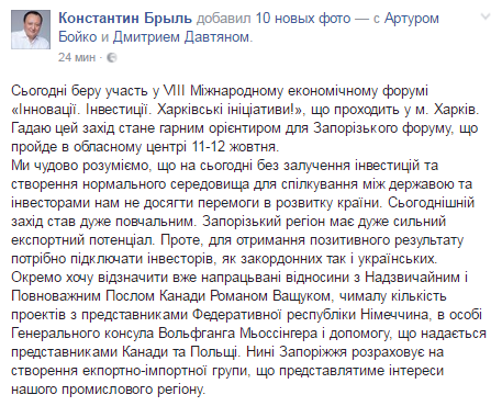 На своей официальной странице в Facebook он написал, что это мероприятие станет хорошим ориентиром для Запорожского форума, который пройдет в областном центре 11-12 октября 2016 года.