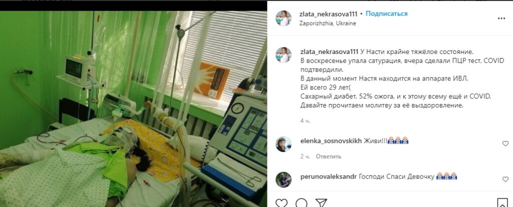 «В воскресенье упала сатурация, вчера сделали ПЦР тест, COVID подтвердили. В данный момент Настя находится на аппарате ИВЛ. Ей всего 29 лет. Сахарный диабет, 52% ожога, и к этому всему ещё и COVID», — написала Злата Некрасова.