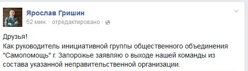 Глава запорожской ячейки партии “Самопомощь” Владислав Марченко покинул пост председателя. Об этом он сообщил вчера, 25 мая, на сборах областной организации «Самопомощь».