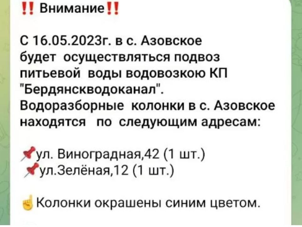 С 16 мая жители села Азовское Бердянского района, города Приморск и микрорайона РТС в Бердянске остались без воды. Российские оккупанты объяснили все поломкой. Воду людям подвезли один раз, и то техническую.