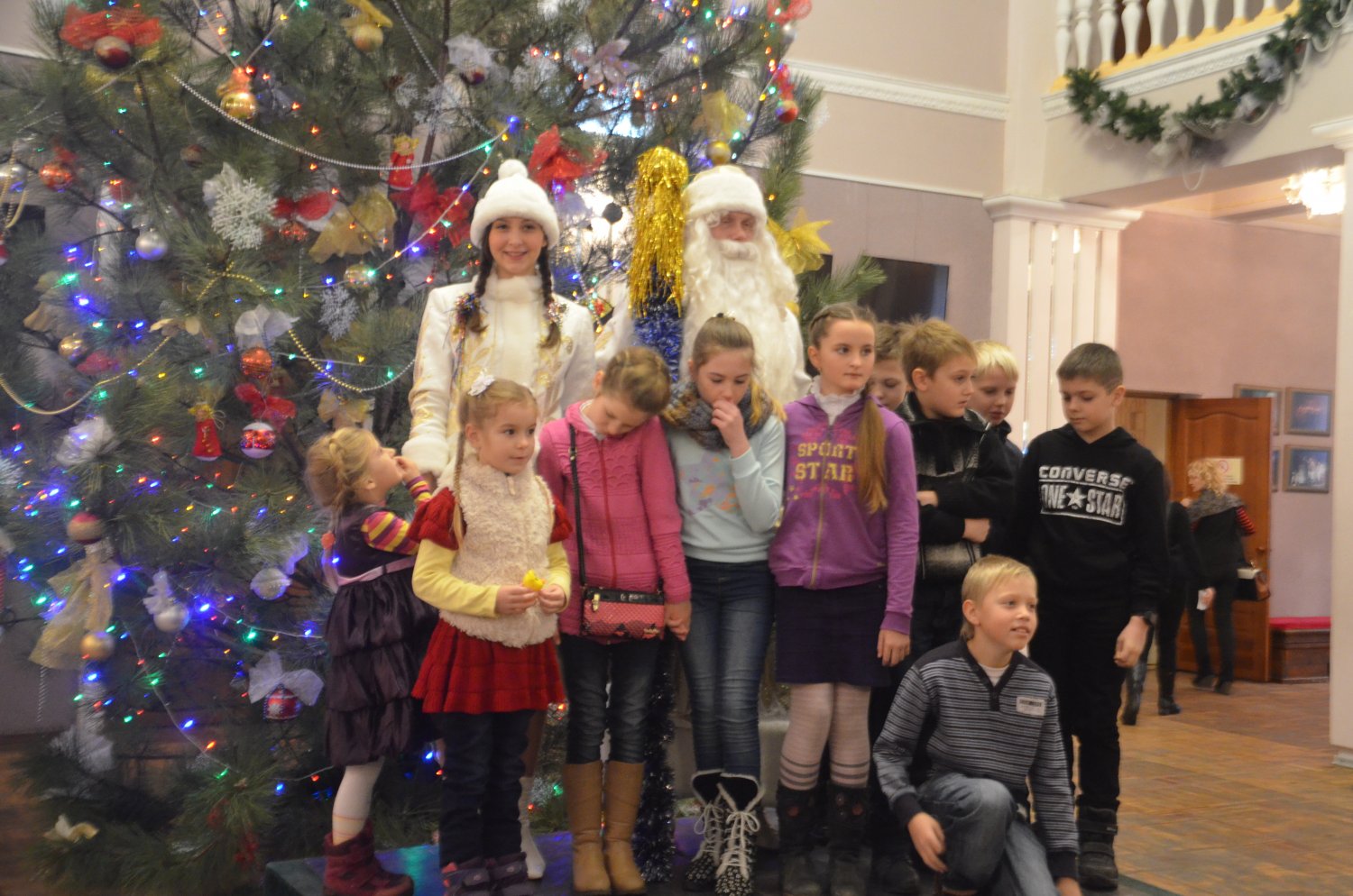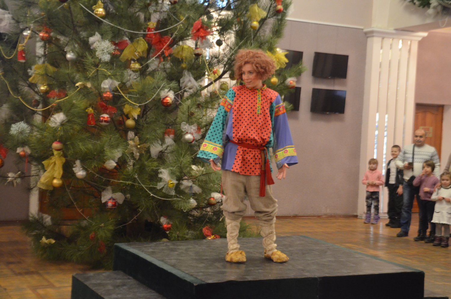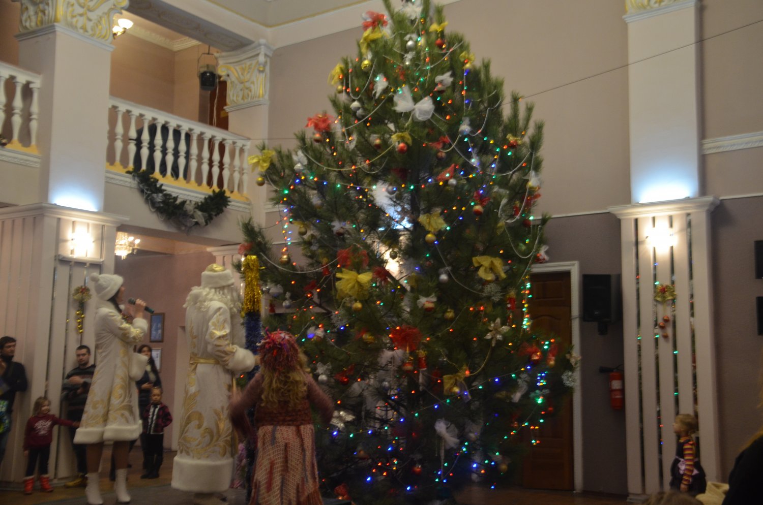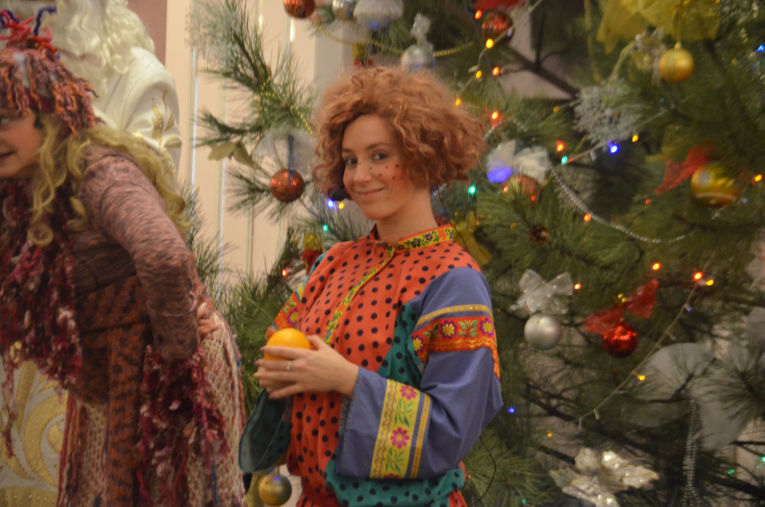 Перед представлением детей развлекали Домовенок и Баба Яга, Дед Мороз и Снегурочка. Все вместе они зажгли на елке огни, и водили хоровод.