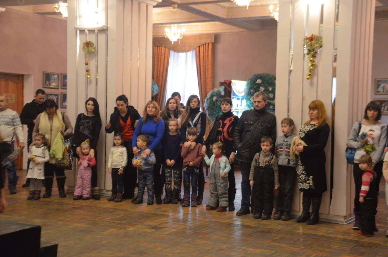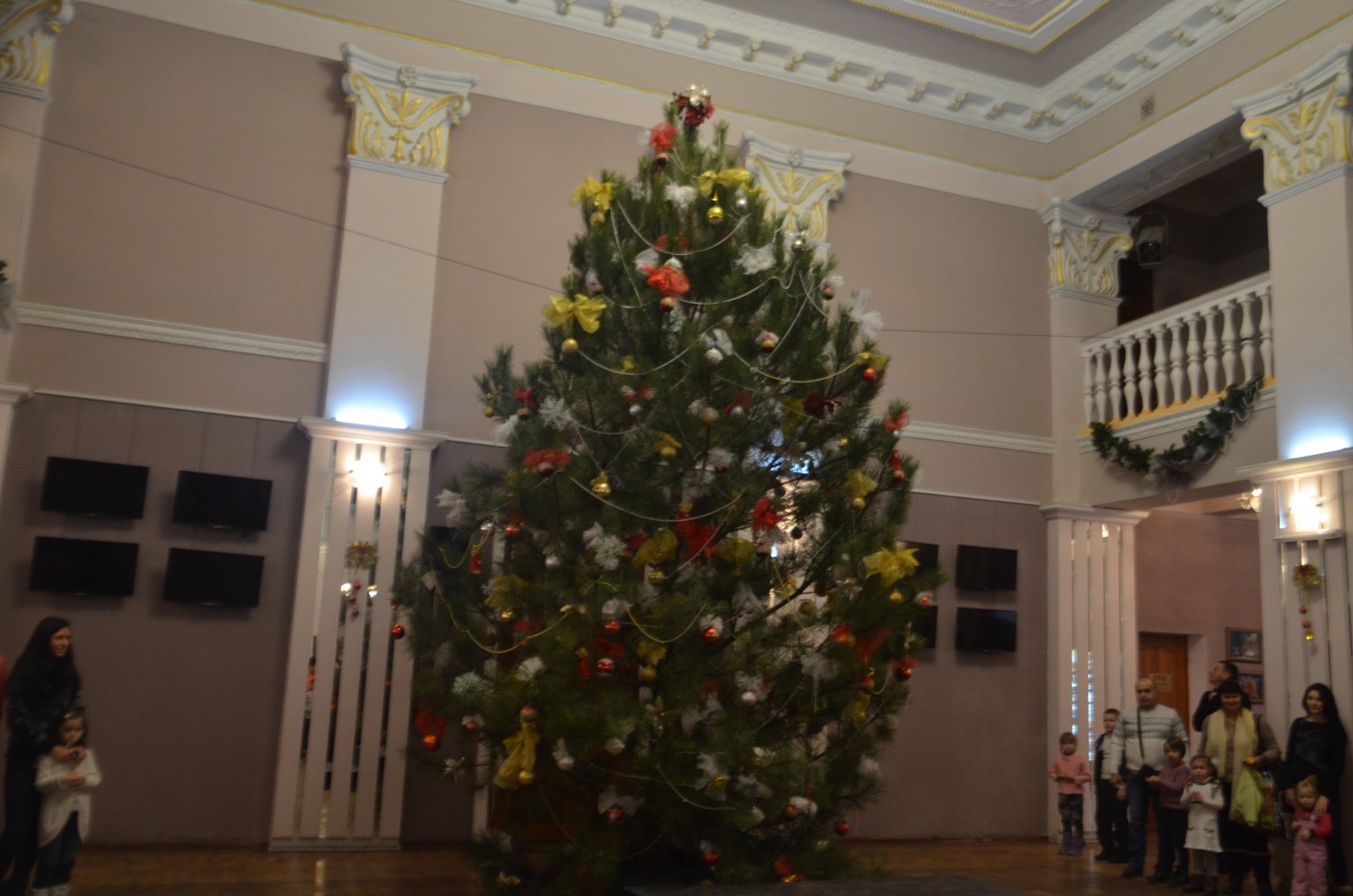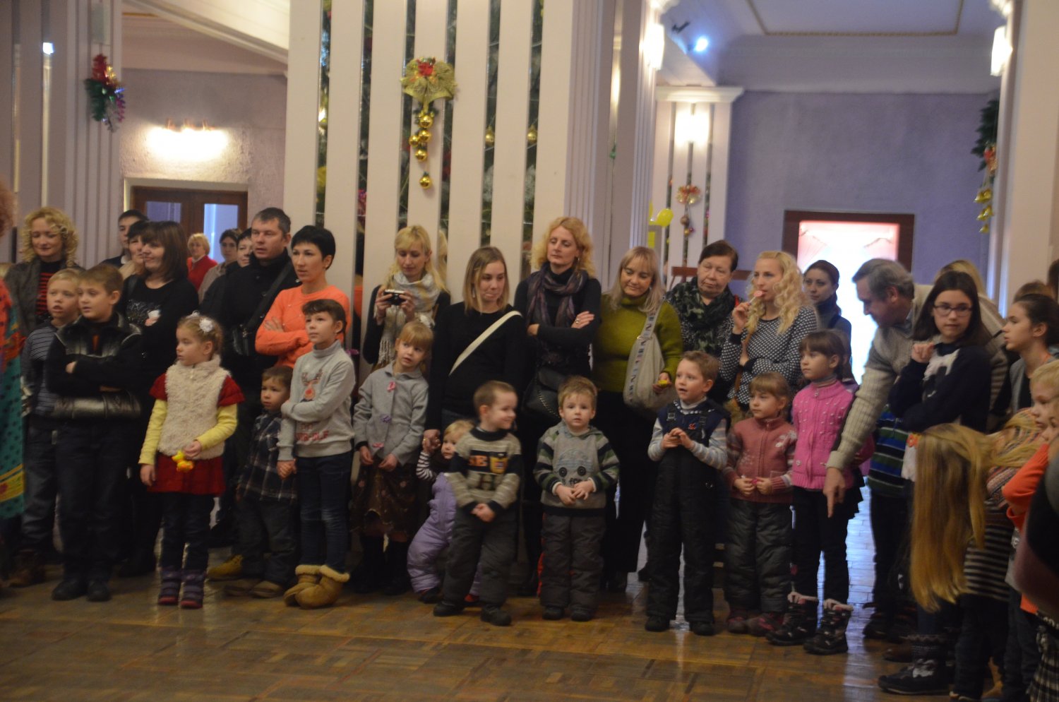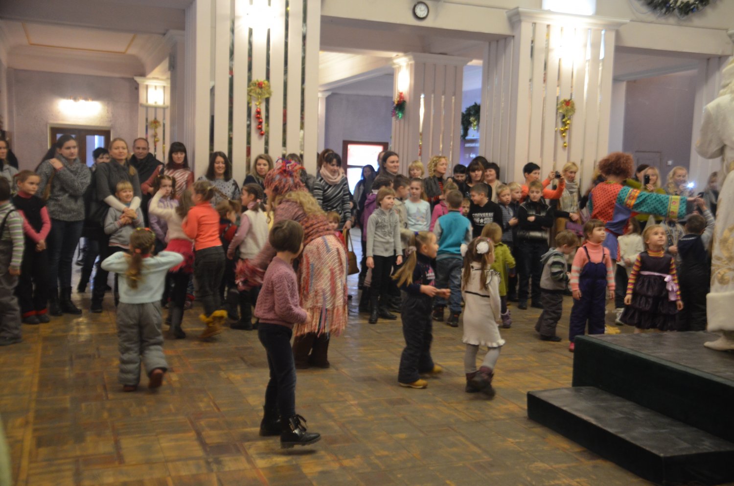 Перед представлением детей развлекали Домовенок и Баба Яга, Дед Мороз и Снегурочка. Все вместе они зажгли на елке огни, и водили хоровод.