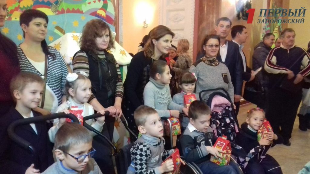 Жена президента Украины Марина Порошенко в рамках сегодняшнего рабочего визита в Запорожье поздравила детей с новогодне-рождественскими праздниками и вручила им сладкие подарки.