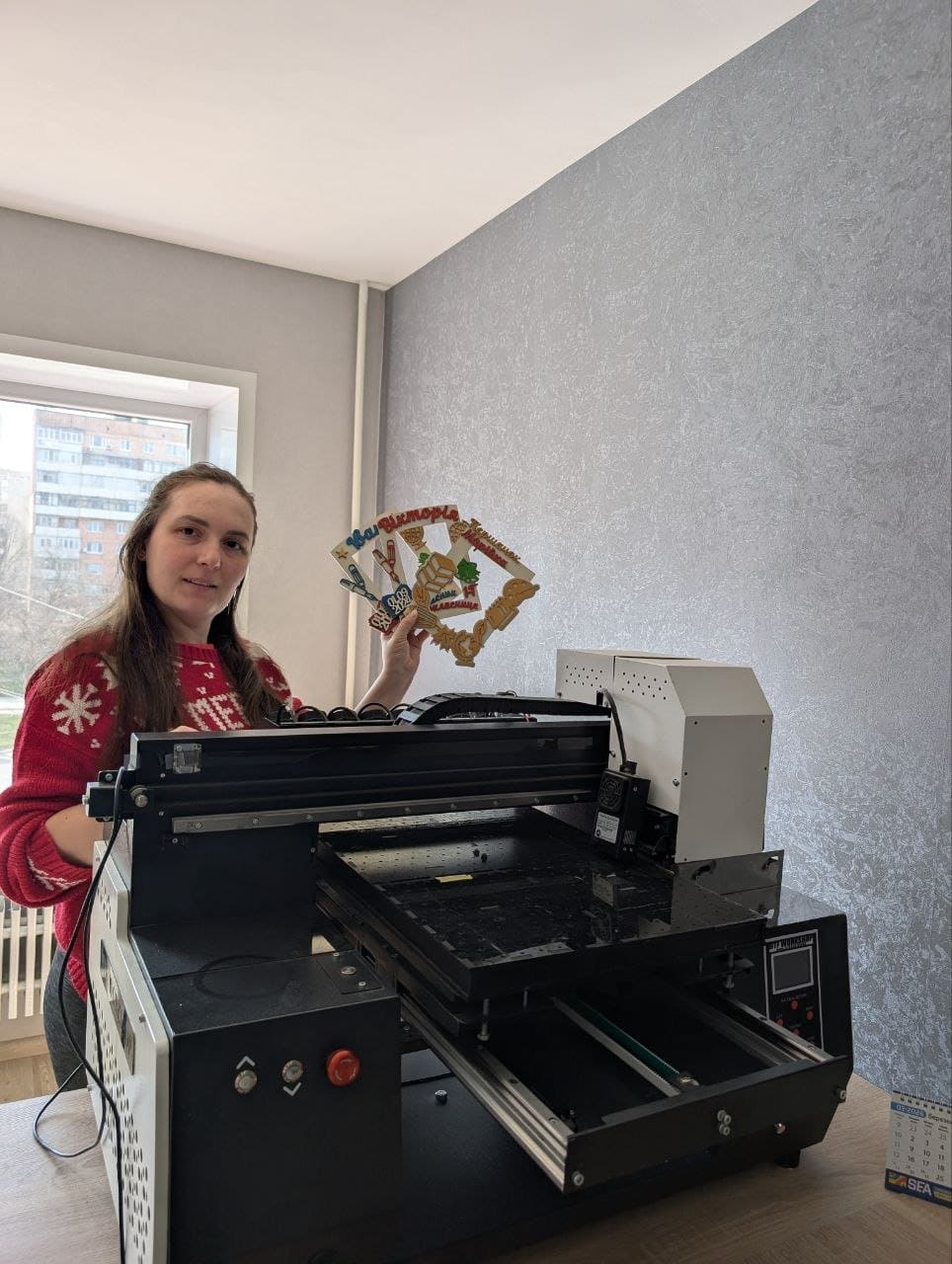 Семья получила грант в размере 300 тысяч гривен. Средства направили на приобретение нового оборудования — принтера для нанесения изображений на твердые поверхности (пластик, дерево и металл), а также на закупку необходимых материалов для старта работы.