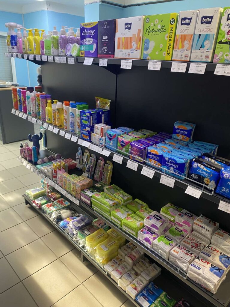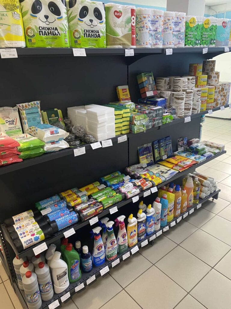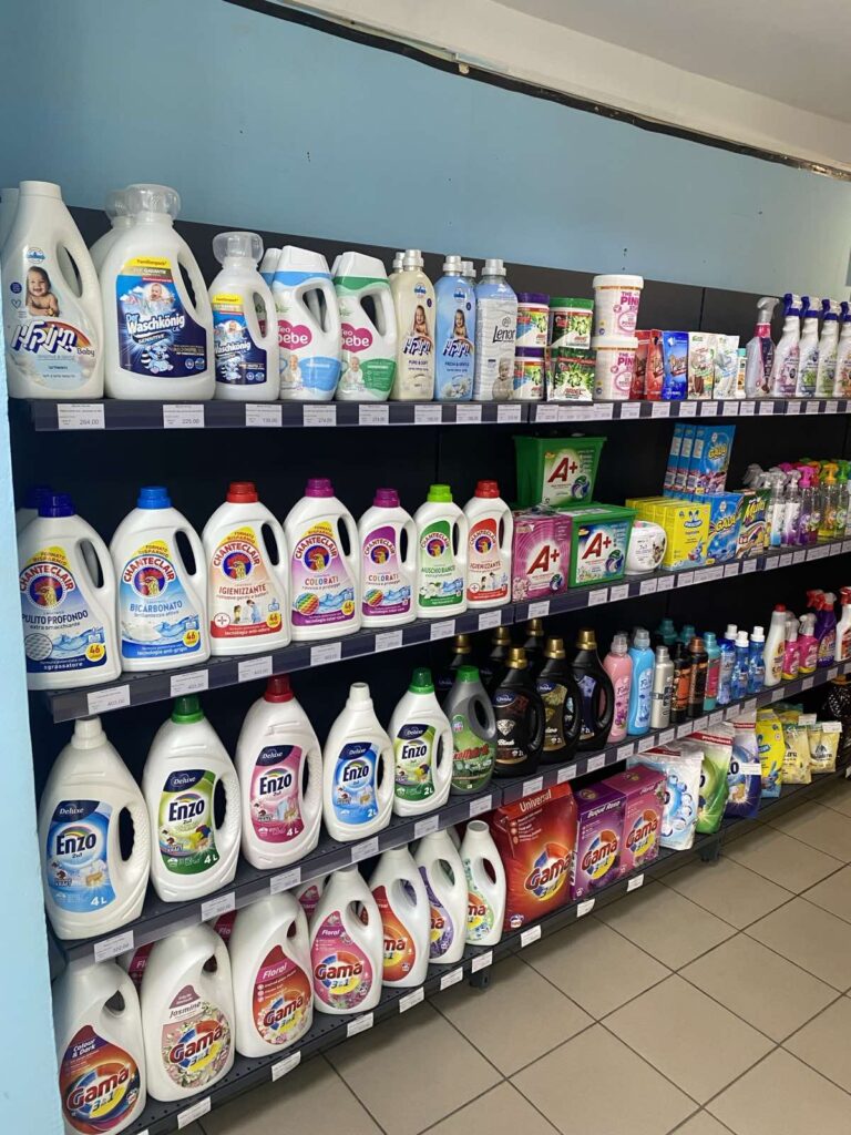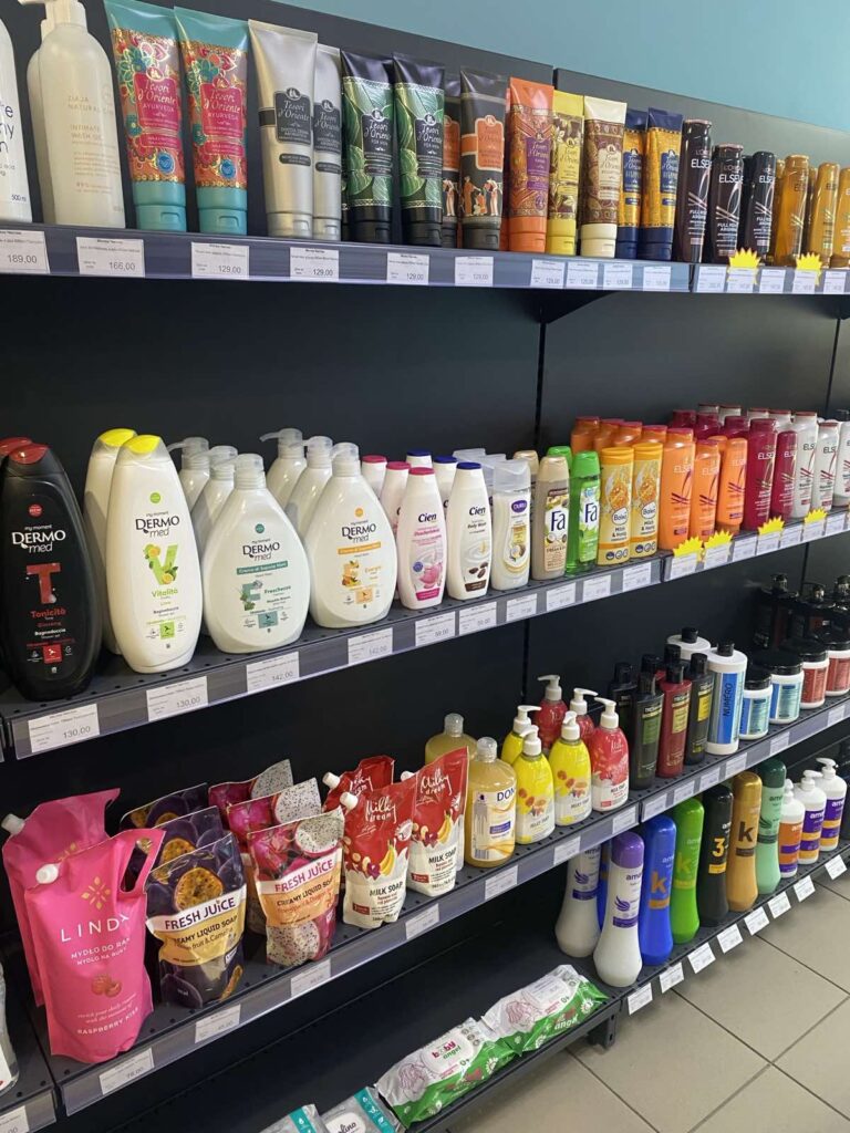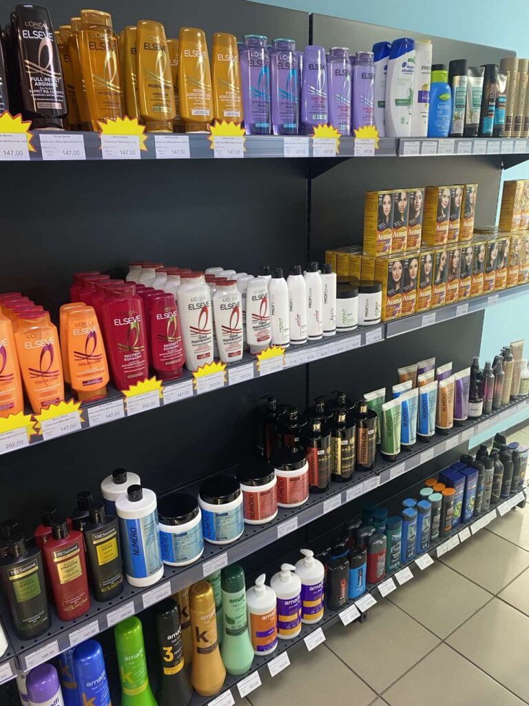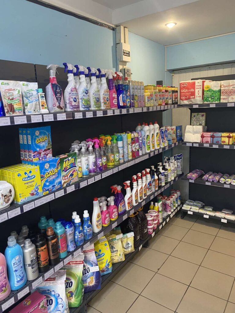 Ассортимент состоит из бытовой химии и включает все необходимое для ухода за домом, телом и волосами: от стиральных порошков и средств для мытья посуды до шампуней, гелей, детских серий и антиперспирантов. Алина формировала ассортимент частично на собственном опыте, но в основном, просматривая сайты оптовых баз и интернет-магазинов, заказывала по несколько товаров разных производителей, чтобы максимально заполнить полки.