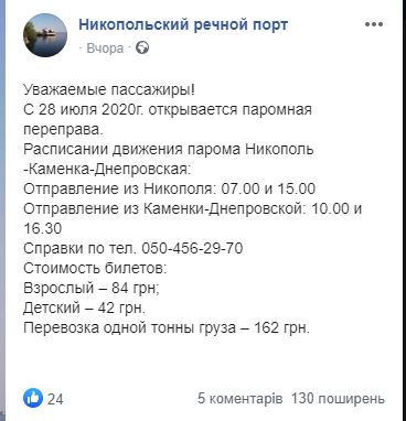 С Никополя (Днепропетровская область) автомобильно-пассажирский паром будет отправляться в 07:00 и 15:00. С Каменки-Днепровской (Запорожская область) — в 10:00 и 16:30.