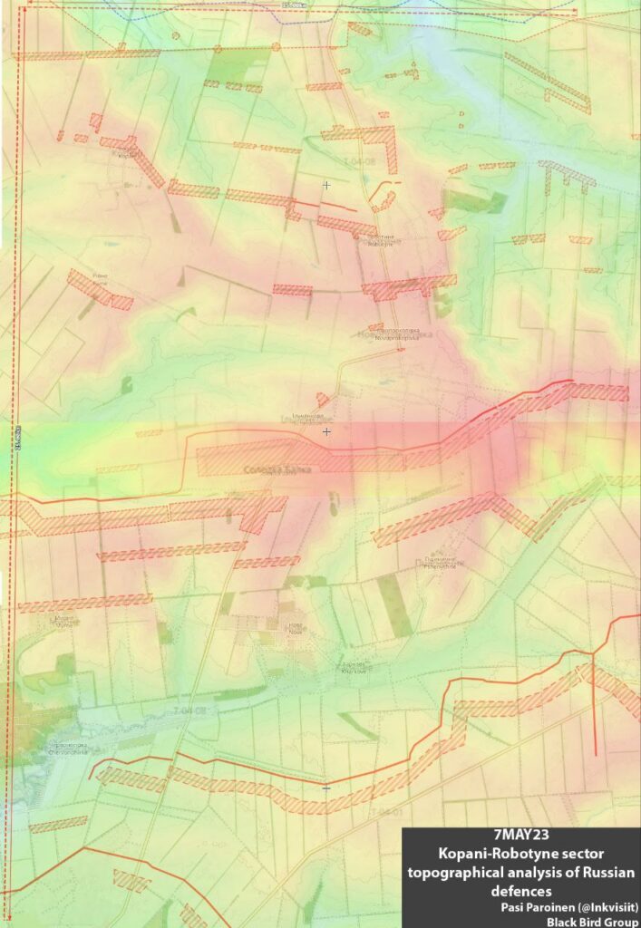 Первая серьезная линия укреплений россиян расположена в 3-5 км от линии фронта вдоль поселков Копани и Роботино. Эти населенные пункты являются опорными пунктами для российских захватчиков. Глубина этой линии обороны составляет 2-3 км и привязана к ключевым элементам рельефа. Между ней и линией фронта – только отдельные аванпосты отделений и взводов, а также опорные ротные пункты.