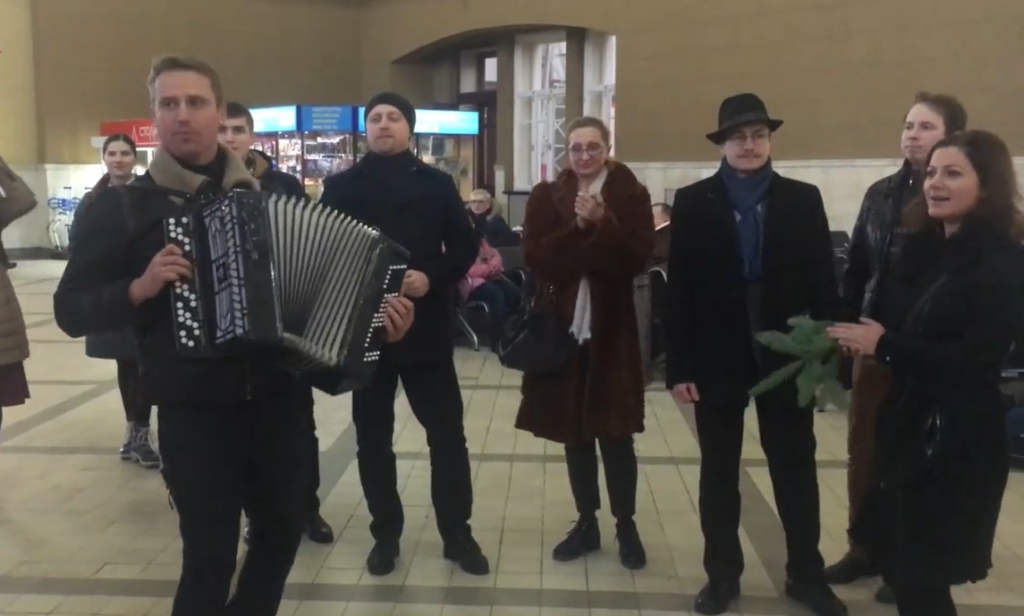 В Москве на Киевском вокзале около пятидесяти человек спели хором «Распрягайте, хлопцы, кoней».