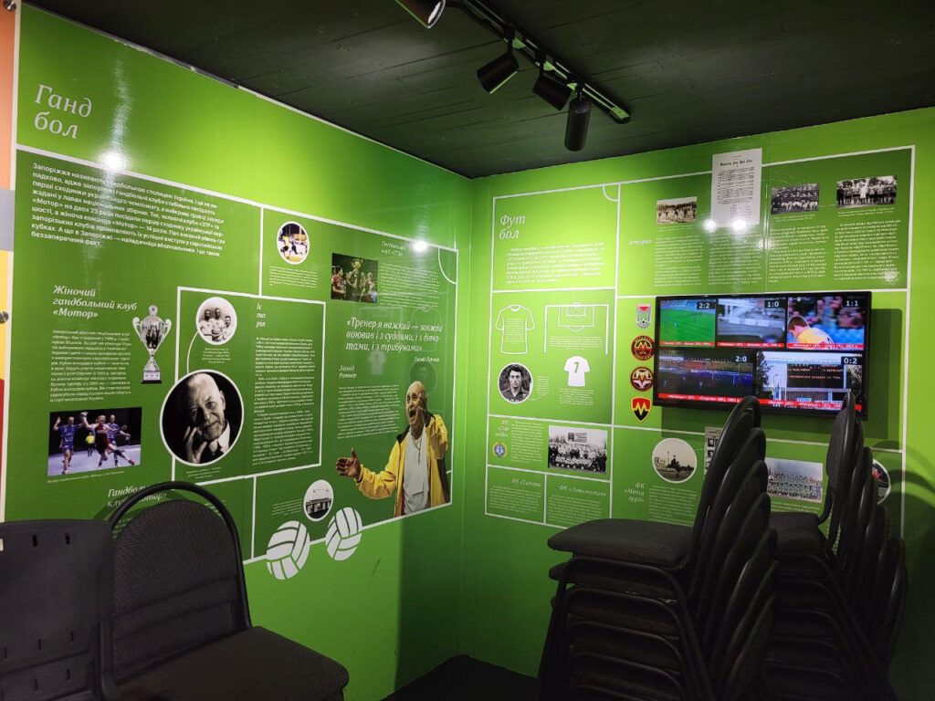 Настоящий центр экспозиции – это запорожский спорт. Город имеет богатое наследие, связанное со стадионом «Славутич-Арена», гребным каналом и другими спортивными заведениями. Здесь можно увидеть истории выдающихся спортсменов, которые сделали Запорожье известным всему миру.