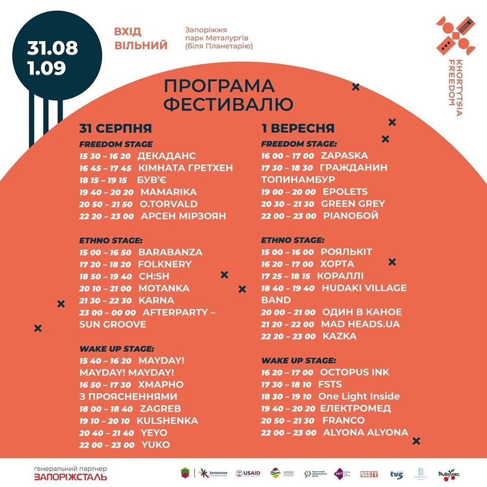 В течение двух дней фестиваля на трех сценах (FREEDOM STAGE, ETHNO STAGE и WAKE UP STAGE) выступят 35 музыкальных коллективов и артистов. KARNA, alyona alyona, Green Grey, YUKO,  Pianoбой, Один в каное, Арсен Мірзоян, KAZKA, Хорта, Гражданин Топинамбур, O.Torvald – лишь некоторые из них.